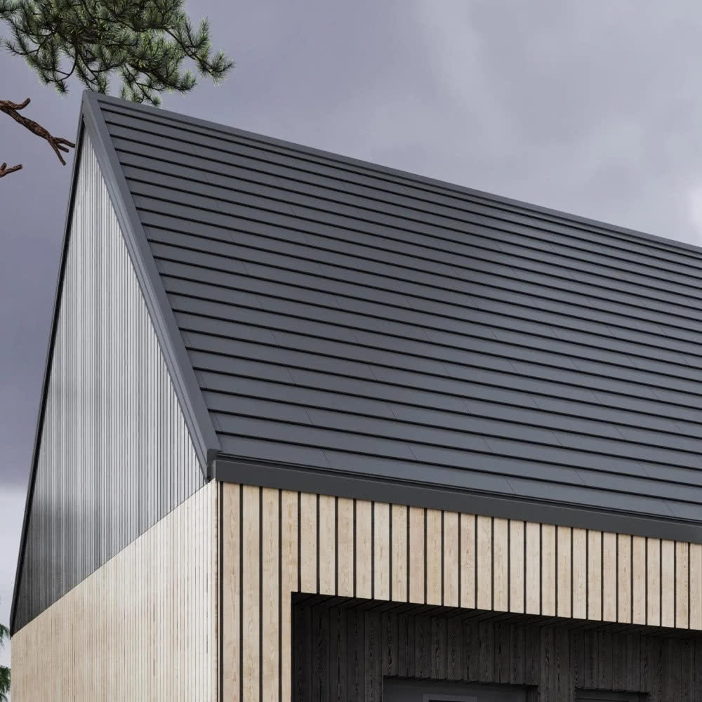Ruukki Hyygge to blachodachówka modułowa o płaskim profilu i gładkiej powierzchni. Jej forma jest uporządkowana i spokojna wizualnie, dzięki czemu pasuje do szerokiego spektrum projektów domów – od klasycznych po bardzo współczesne.