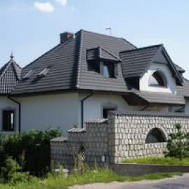 Układanie dachówek i wykończenie krawędzi bocznych dachu - stosujemy dachówki krawędziowe lewe i prawe. Dachówka krawędziowa musi posiadać odstęp min. 10 mm między swoją wewnętrzną krawędzią a wiatrownicą. Zanim obetniemy łaty układamy dwa rzędy próbne na dole dachu. Rozpoczynamy układanie od najniższego, prawego narożnika połaci. Trzy skrajne prawe kolumny dachówek mocujemy do łat. Układamy pozostałe dachówki stale kontrolując (za pomocą sznura lub przymiaru) liniowość w długości połaci. Mocujemy również trzy skrajne lewe kolumny dachówek oraz dwa najwyższe rzędy pod kalenicą.