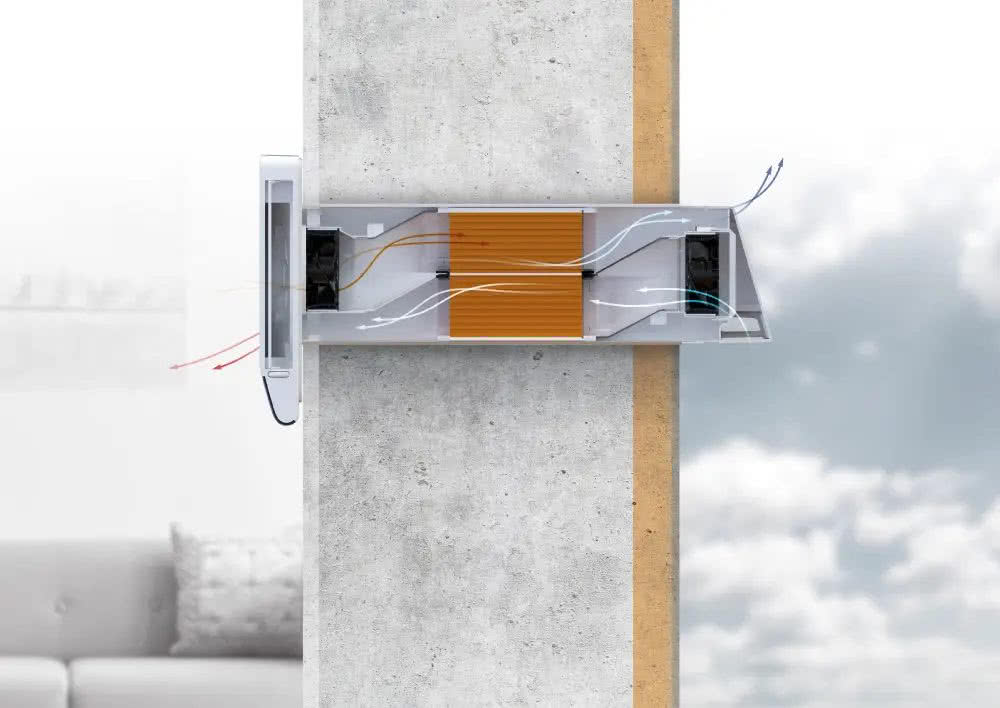 Urządzenie montuje się bezpośrednio w ścianie zewnętrznej, a wymiana i odzysk ciepła odbywa się poprzez jeden, pojedynczy otwór. Rekuperatory ścienne są kompaktowe i łączą w sobie wszystkie niezbędne funkcje: nawiew, wywiew oraz odzysk ciepła.