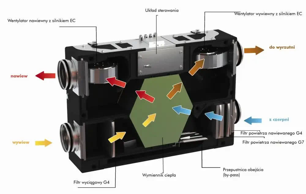 - Dwa wentylatory: jeden odpowiedzialny za nawiew świeżego powietrza do wnętrza, a drugi za wywiew zużytego powietrza na zewnątrz.