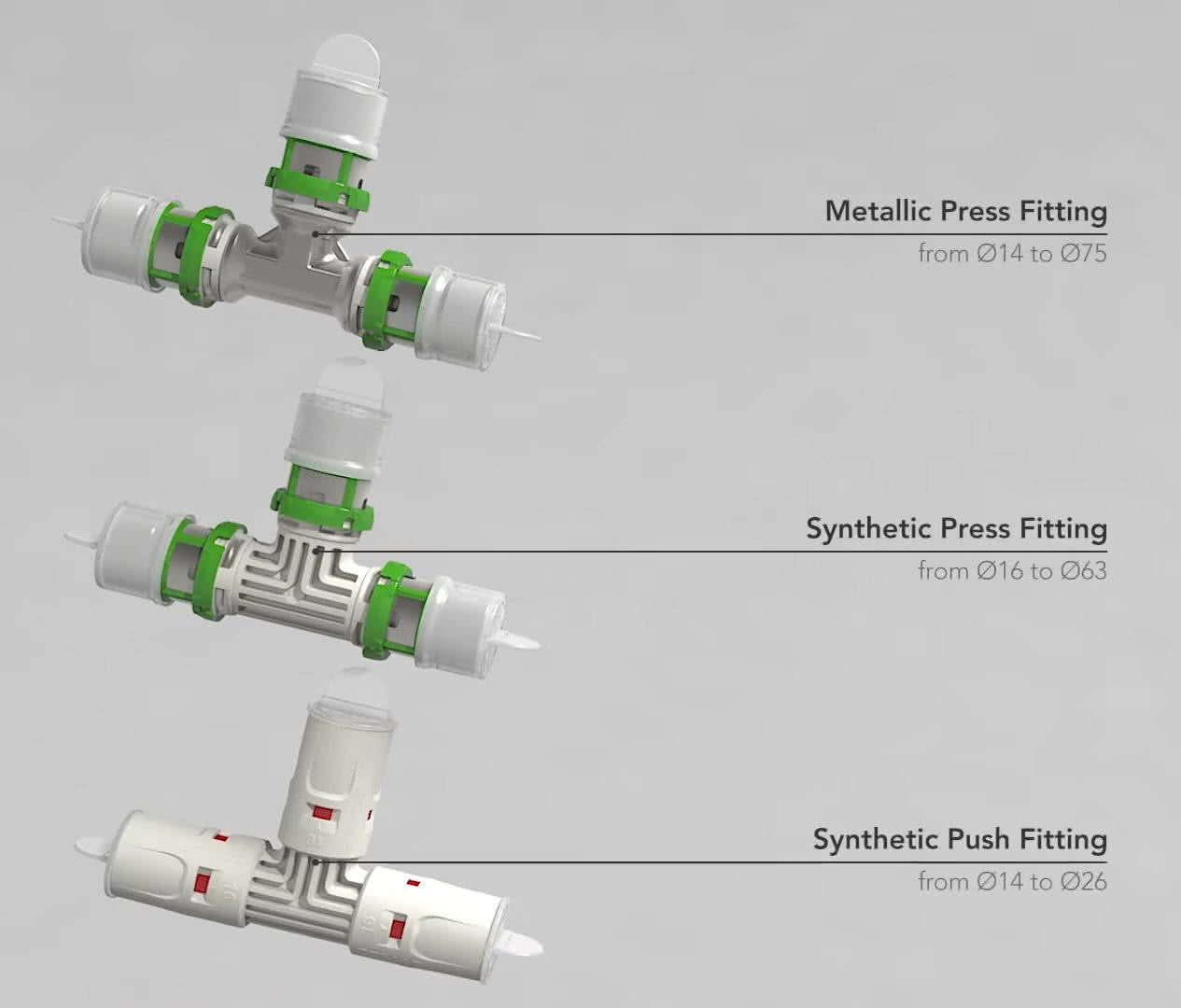Dostępne są między innymi metalowe złączki zaciskane do pełnego zakresu wymiarów, a także elementy z wytrzymałego tworzywa sztucznego PPSU. Złączki syntetyczne występują w wariantach zaprasowywanych dla średnic od 16 do 32 mm oraz w wersjach na wcisk dla rur od 14 do 26 mm.