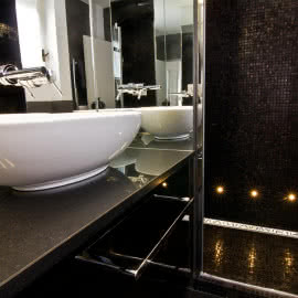 Odwodnienie liniowe Vabo jest wbudowane w powierzchnię podłogi i przykryte eleganckim panelem o właściwościach antypoślizgowych. Dzięki temu uzyskujemy płynne przejście do strefy prysznica, a pozostała powierzchnia podłogi jest sucha.