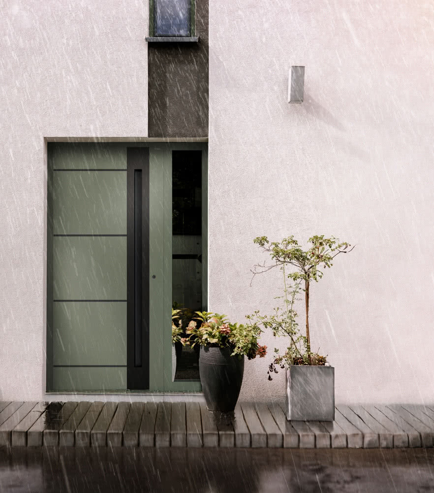 Dzięki temu drzwi nie ulegają odkształceniom, nie tracą szczelności i nie zmieniają swojego wyglądu, nawet gdy stanowią pierwszą linię kontaktu z czynnikami atmosferycznymi.