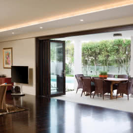 To połączenie drzwi, moskitiery, rolety i okuć w jednym pięknie zaprojektowanym systemie umożliwia mieszkańcom otwarcie ich domu na otoczenie bez żadnych kompromisów, za to z możliwością pełnej kontroli prywatności, światła słonecznego, owadów i przepływu powietrza przez cały rok. I to bez względu na to, czy wybiorą do swojego domu drzwi składane (harmonijkowe), przesuwne, pojedyncze czy podwójne.