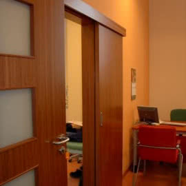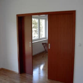 drzwi przesuwne naścienne z ościeżnicą i słupem przymykowym - skład kompletu: skrzydło drzwiowe, szyna do drzwi przesuwnych, prowadnica punktowa, maskownica fornirowana lub lakierowana lakierem kryjącym (bez struktury drewna), ościeżnica obejmująca regulowana ze słupem przymykowym; standardowe wymiary otworów: 800/2060 mm oraz 900/2060 mm