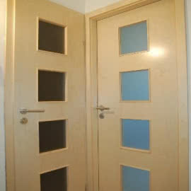 drzwi uchylne - ramiak skrzydła wykonany z drewna iglastego, wypełnienie stanowi płyta wiórowa otworowa, waga skrzydła ok 20 kg; szyby, wstawiane w estetycznej ramce, ze szkła hartowanego, bezpiecznego, satynowanego, o grubości 6 mm; w skład kompletu wchodzi: płyta skrzydła wraz z ewentualnymi przeszkleniami, zawiasy ze stali nierdzewnej, zamek, bulaj (w przypadku drzwi modelu bulaj) ze stali nierdzewnej, listwy aluminiowe lub ze stali nierdzewnej (w przypadku drzwi modelu Atos); ościeżnice wykonane są z płyty MDF pokrytej fornirem; w skład kompletu ościeżnicy regulowanej wchodzi: belka główna, dwa elementy pionowe i elementy maskujące, uszczelka drzwiowa, zawiasy, zakres regulacji: od 80 do 338 mm