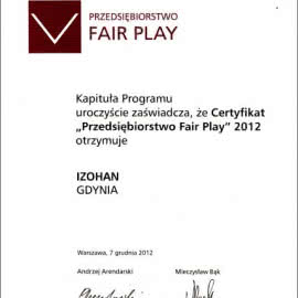 Po raz kolejny firma IZOHAN Sp. z o.o. została wyróżniona certyfikatem „Przedsiębiorstwo Fair Play”, jest to już trzynasta nagroda z rzędu. Zdobyty certyfikat świadczy o rzetelności i wysoce etycznym zachowaniu firmy w kontaktach z klientami, społecznością lokalną, państwową jak i pracownikami firmy. Potwierdza jej uczciwość, solidność, dbałość o interesy całego jej otoczenia.
