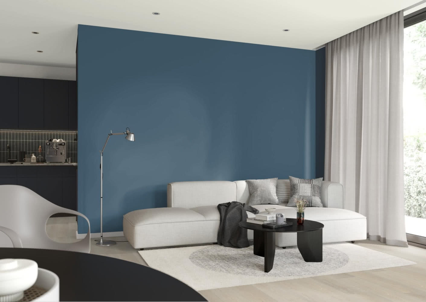 Rozmieszczenie barwy Pacific 100 na tle Cloud Dancer pozwala na optyczne modelowanie przestrzeni, przyciąganie wzroku do konkretnych punktów oraz nadanie wnętrzu dynamiki, która jest niezbędna w nowoczesnych projektach mieszkalnych i komercyjnych.