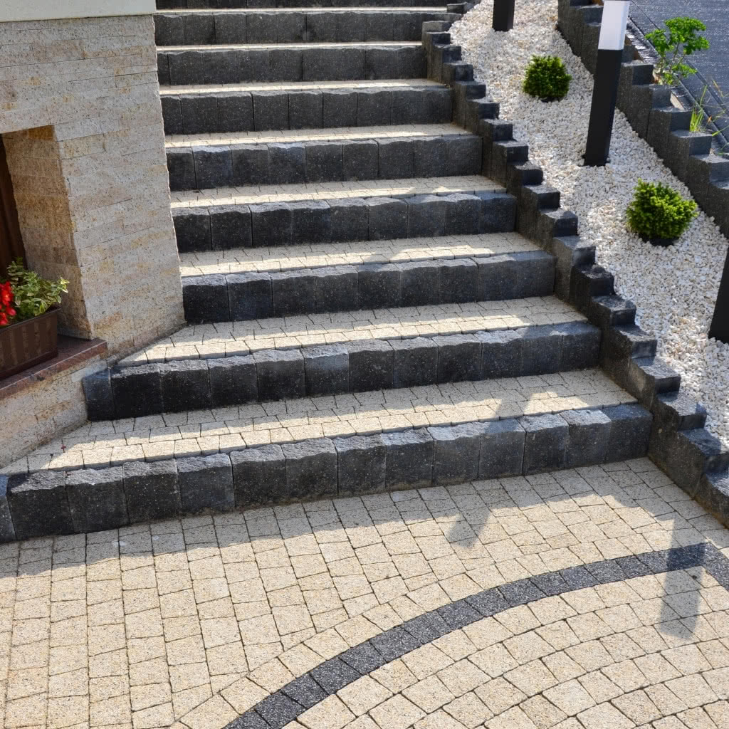 Ścieżki prowadzące wokół domu są stale narażone na częste użytkowanie, opady deszczu i niskie temperatury. W takich miejscach świetnie sprawdzają się kostki w mieszanych kolorach, gdzie kilka odcieni przenika się, co doskonale ukrywa codzienne zabrudzenia.