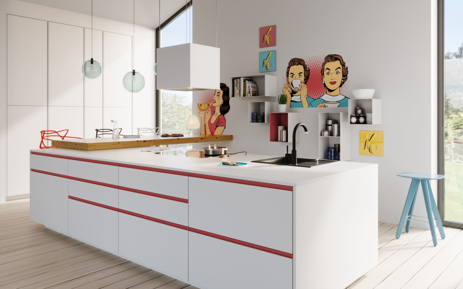 Minimalistyczne formy potrafią zabrzmieć wyjątkowo, gdy dostaną odważny akcent barwny. Gładkie, białe fronty wyspy skontrastowane z poziomymi, czerwonymi uchwytami dodają energii, porządkują poziome podziały i „narysowują” bryłę.