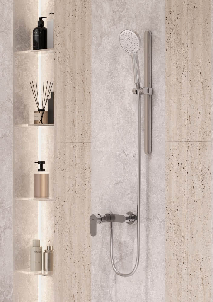 W aranżacjach opartych na jasnym kamieniu i geometrycznych podziałach ścian chrom nie konkuruje z materiałem tła. Zamiast tego podkreśla precyzję linii i daje wrażenie technicznego ładu, które w łazience jest równie ważne jak dekoracyjność.