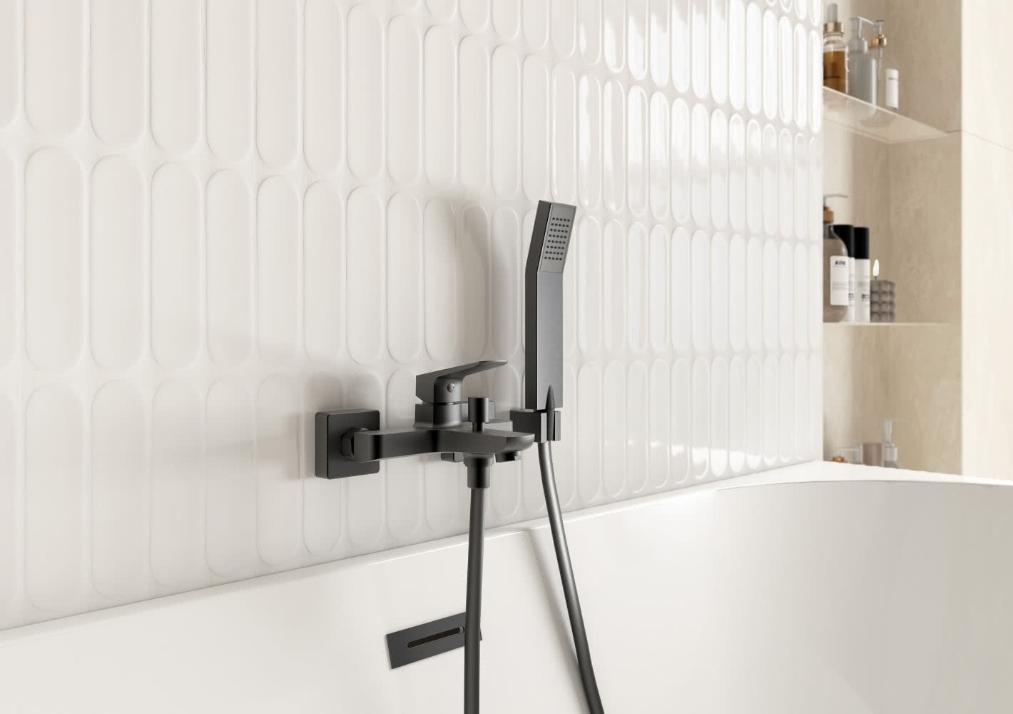 Oszczędny design i wyważona linia armatury stanowią przeciwwagę dla miękkich kształtów ceramiki sanitarnej, wzmacniając nowoczesny charakter projektu. Zastosowanie małych, strukturalnych płytek na ścianach pozwala na ciekawą pracę ze światłem, które tworzy na ich powierzchni delikatne cienie, podkreślając rytm wnętrza.