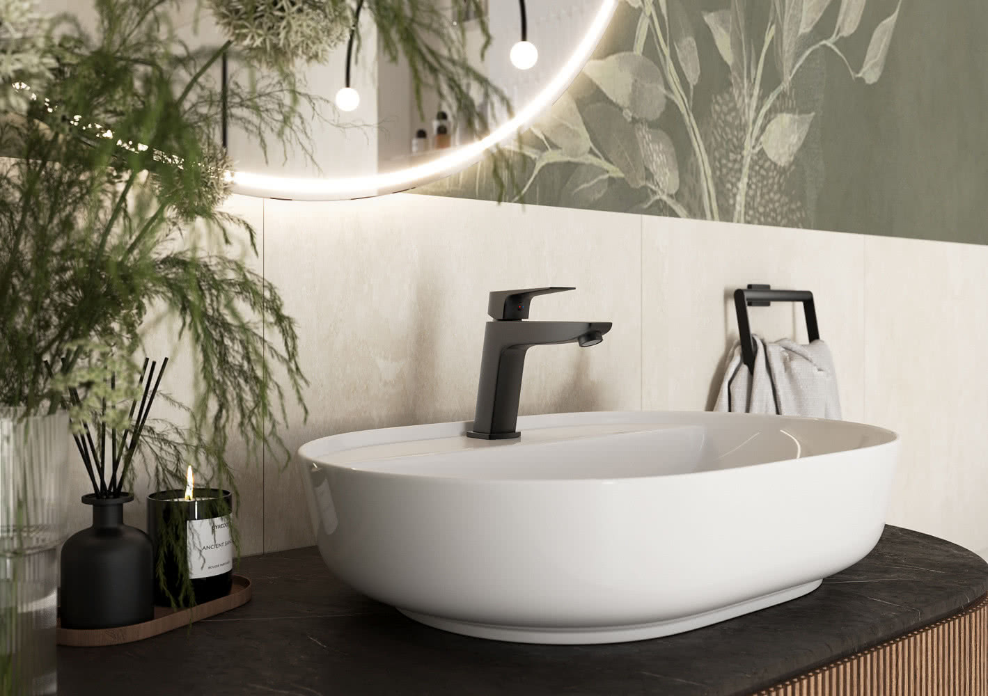 Strefa umywalkowa pełni funkcję reprezentacyjną, dlatego dobór armatury w tym miejscu ma kluczowe znaczenie dla estetyki całego wnętrza. Centralnym punktem jest tutaj obszerna misa nablatowa o łagodnym profilu, osadzona na ciemniejszym blacie, co buduje wyraźne odcięcie od jasnych ścian.