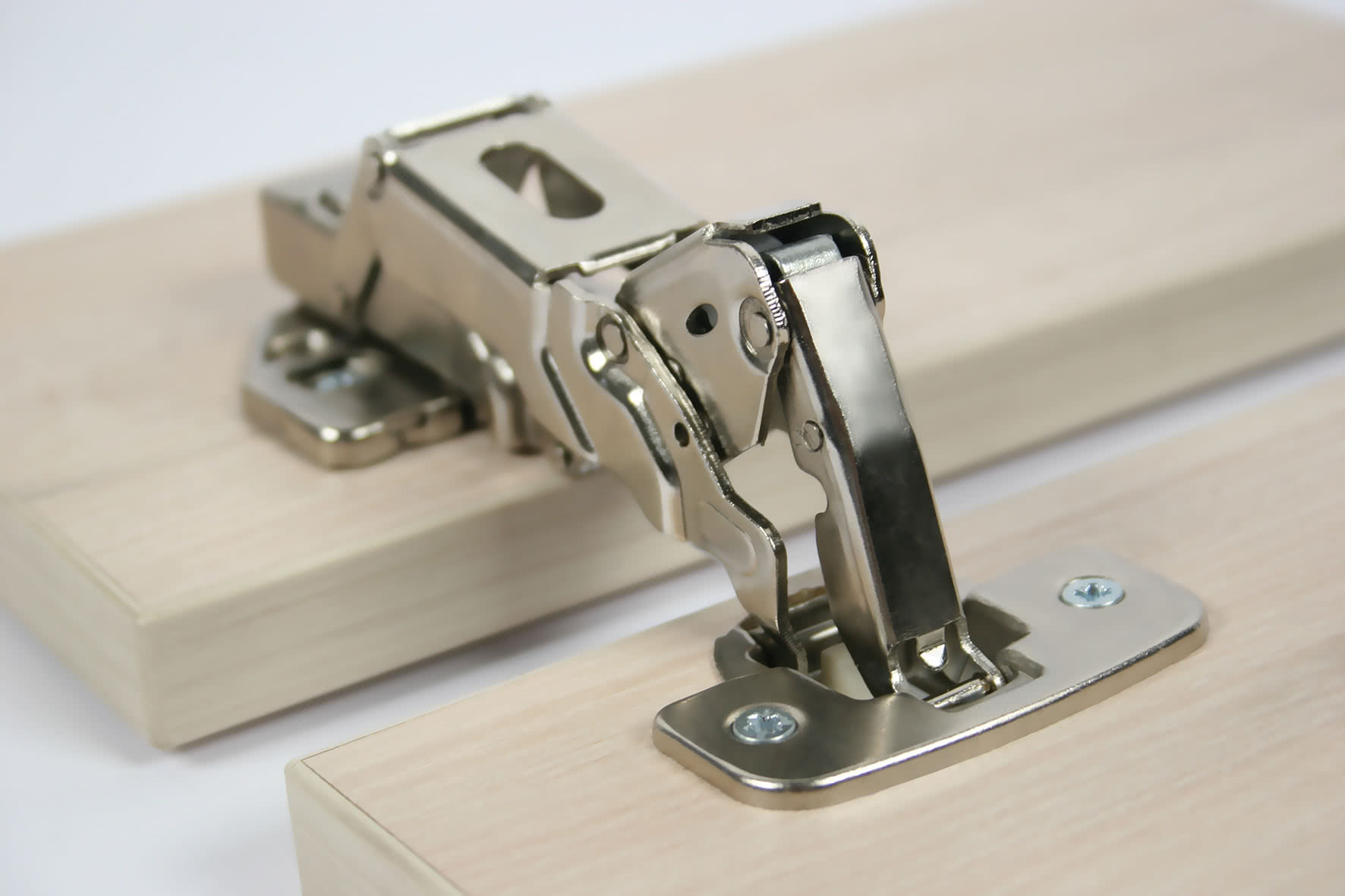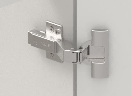 Nowoczesne zawiasy, szczególnie te z wyższych linii produktowych, wyposażone są w technologię click-on. Pozwala ona na błyskawiczne zapięcie ramienia okucia bez jakiegokolwiek dokręcania śrub.