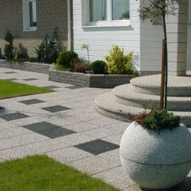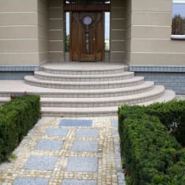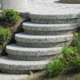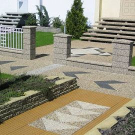 - schody i stopnie zewnętrzne - proces prefabrykacji wyrobów umożliwia osadzenie w betonie wycieraczek i otworów montażowych do balustrady; produkcja w technologii batonu płukanego zapewnia podstawowe wymagania użytkowe: odporność na ścieranie, antypoślizgowość, estetykę i łatwość utrzymania w czystości; trwałość faktury i bogata gama kolorów