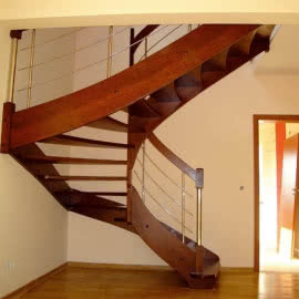 balustrada - elementy drewniane pionowe, wstęgi poziome, elementy kute, drewno łączone z chromoniklem, szkło bezpieczne, poręcz drewniana