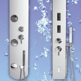 Nowoczesny charakter dodatkowo podkreśla nierdzewna stal INOX, z której wykonano panele. W panelach masażowych, zastosowano wiele praktycznych rozwiązań: powłoka zabezpieczająca panel przed osadzaniem się kamienia, głowice prysznicowe, słuchawki i dysze z funkcją łatwego usuwania kamienia oraz mieszacze termostatyczne z zabezpieczeniem przeciwpoparzeniowym.